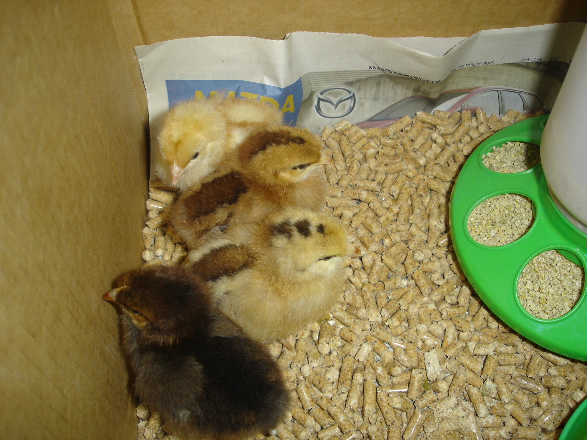 Well, I did it. Today. I went out and got some baby chicks. I got four. One Golden Sex Link, one Black Sex Link and two Ameraucanas. I knew that I wanted the Ameraucanas and I originally wanted a Red Sex Link. My poor hubby. While I was out today I called the store to see what breeds of chicks they had received and they didn’t have Red Sex Link, but they did have Golden Sex Link. So, since I have a dumb phone, I used said phone to call my hubby to ask him to look up the Golden Sex Link online to see if it looked like the Red Sex Link. His first response? “Oh, this is going to be a bad search. Don’t blame me for whatever comes up.” It is a bizarre name for a chicken. I am picturing him rolling his eyes as I try and get a good idea of what the adult chickens looked like from his description. “Um. It’s sort of reddish. Not too yellow. Not as yellow as I would have thought from the name.” What a good hubby.